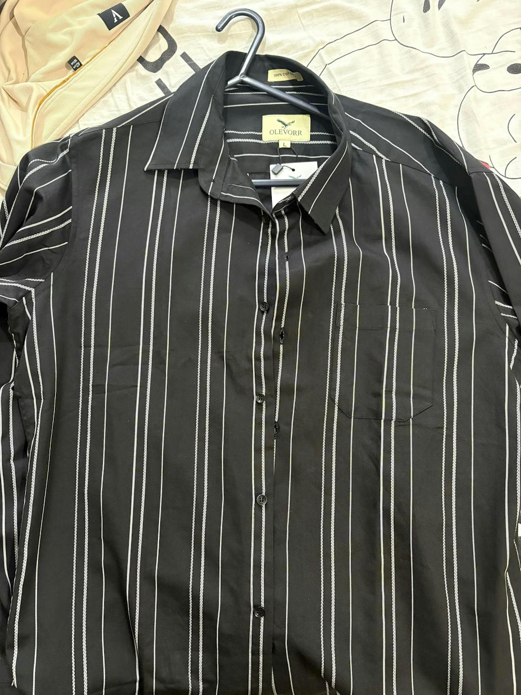 Designed with crisp white stripes on a deep black base, this shirt offers a sleek balance of boldness and refinement. Featuring a classic collar and full sleeves, it transitions effortlessly from smart office wear to laid-back weekend style.